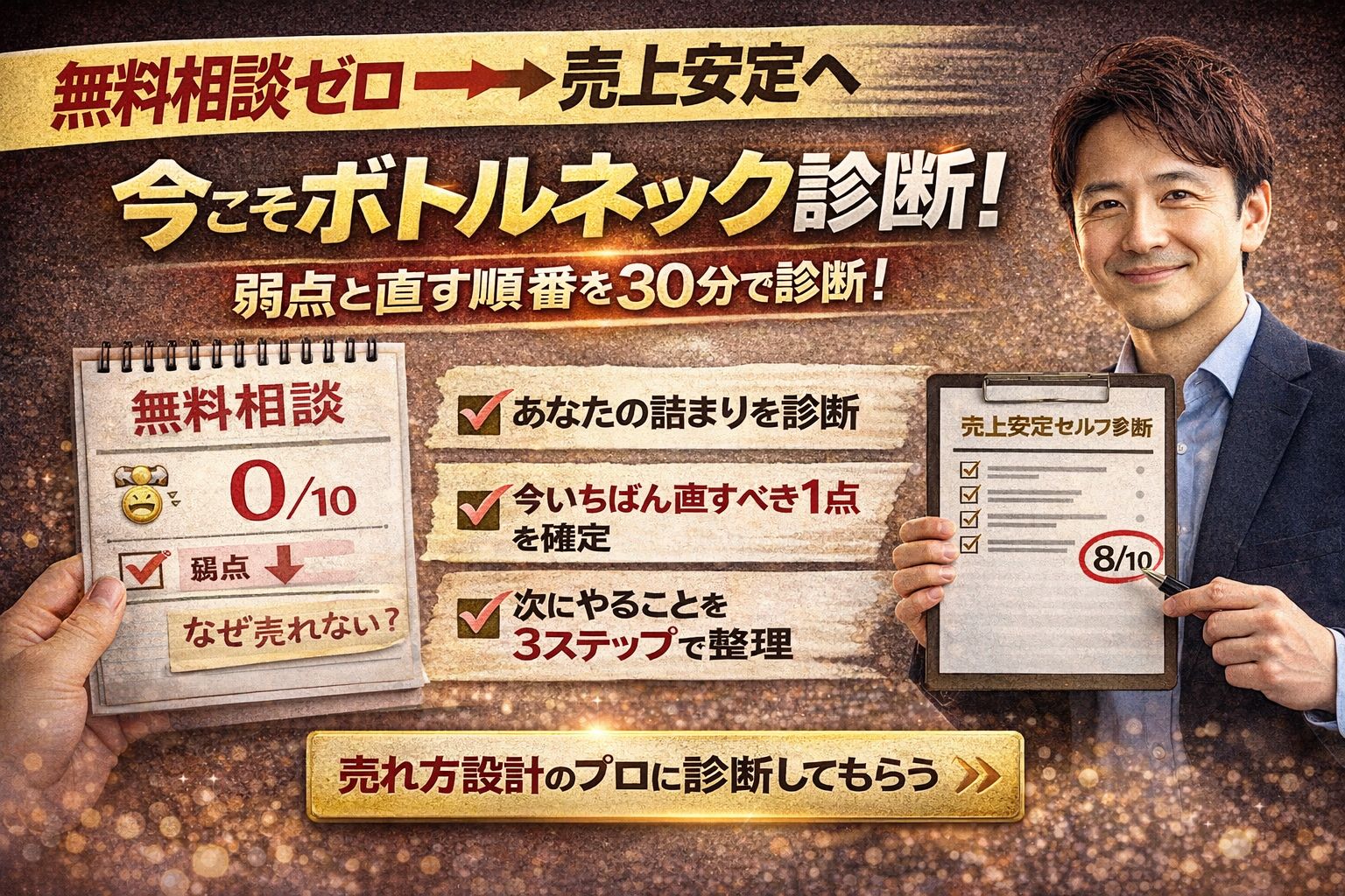 今日は、あなたのビジネスの現在地をあぶり出す「売上安定セルフ診断(10点満点)」をお届けします。